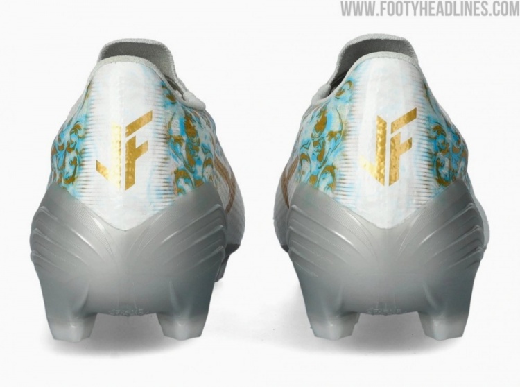 这个专属logo首次亮相于全新发布的美津浓Alpha III菲利克斯专属战靴上,它以醒目的金属质感呈现在两只球鞋的后跟处,与白色鞋底和蓝金相间的球鞋侧面图案形成呼应。
