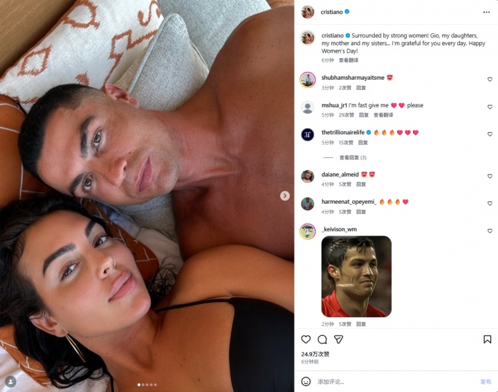 C罗配文写道:“周围都是女强人!乔治娜、我的女儿们、我的妈妈还有姐姐们……我每天都很感激你们,妇女节快乐!”